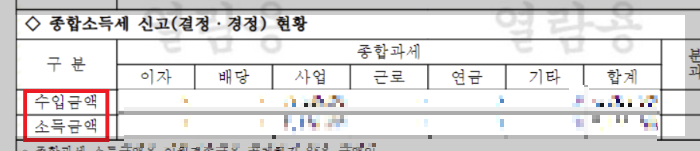 여기서 구분을 보면 [수입금액] 이 있고 [소득금액] 이 있는데, 수입금액은 매출 자체를 의미합니다. 따라서 실질적인 소득 항목이 필요한 경우에는 [소득금액] 을 확인하시면 됩니다.