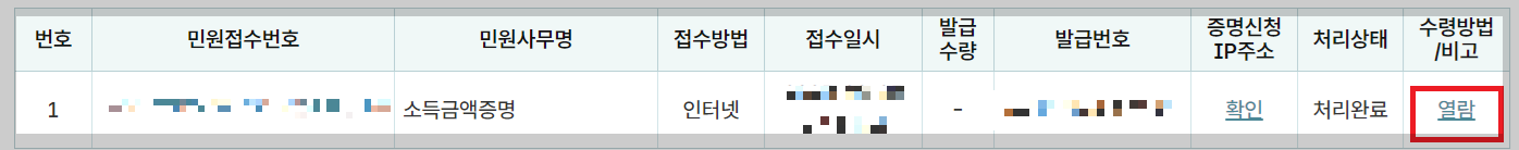 대부분의 경우에는 신청하자마자 처리상태가 [처리완료] 로 변경됩니다. [수령방법/비고] 에서 [열람] 또는 [출력]을 눌러 서류를 확인할 수 있습니다. 참고로, pdf로 저장하는 방법은 [출력]으로 선택한 후 출력화면에서 프린터기 선택을 [pdf로 저장]을 누르면 해당 파일로 저장이 가능합니다.