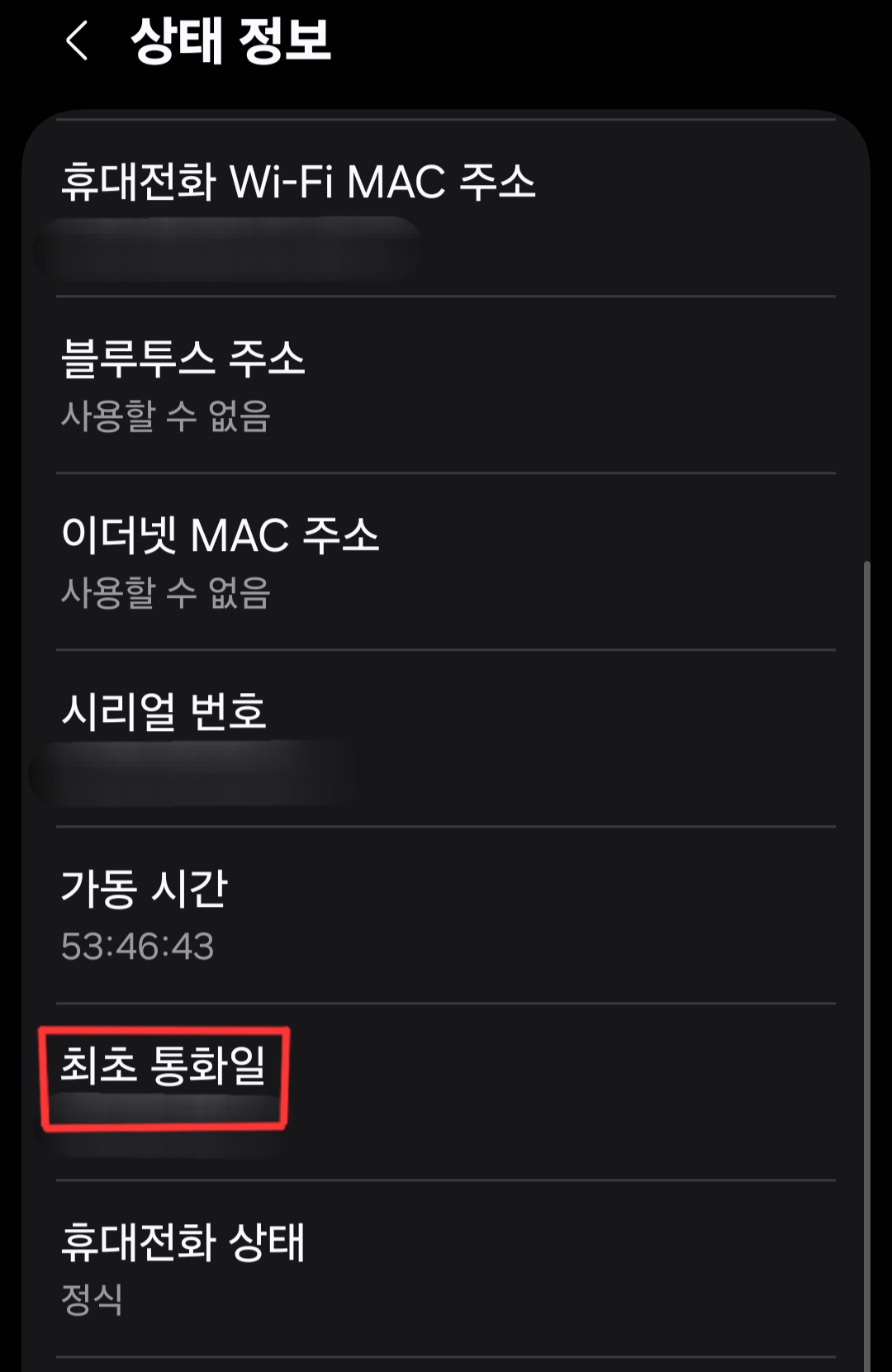 상태 정보 아래쪽에서 [최초 통화일] 메뉴를 확인할 수 있습니다. 최초 통화일 바로 아래에 적힌 날짜가 이 핸드폰으로 첫 통화를 한 날짜입니다.
