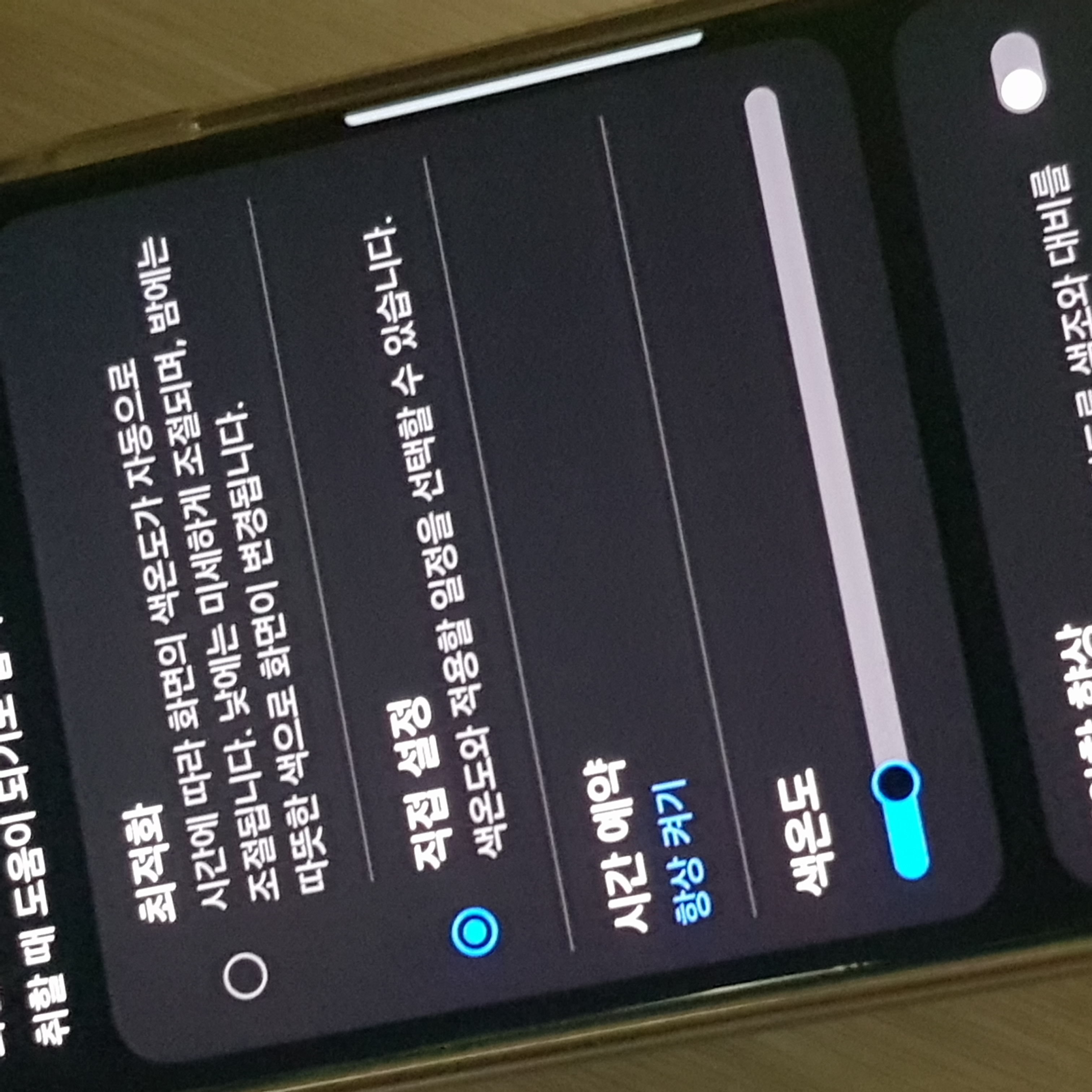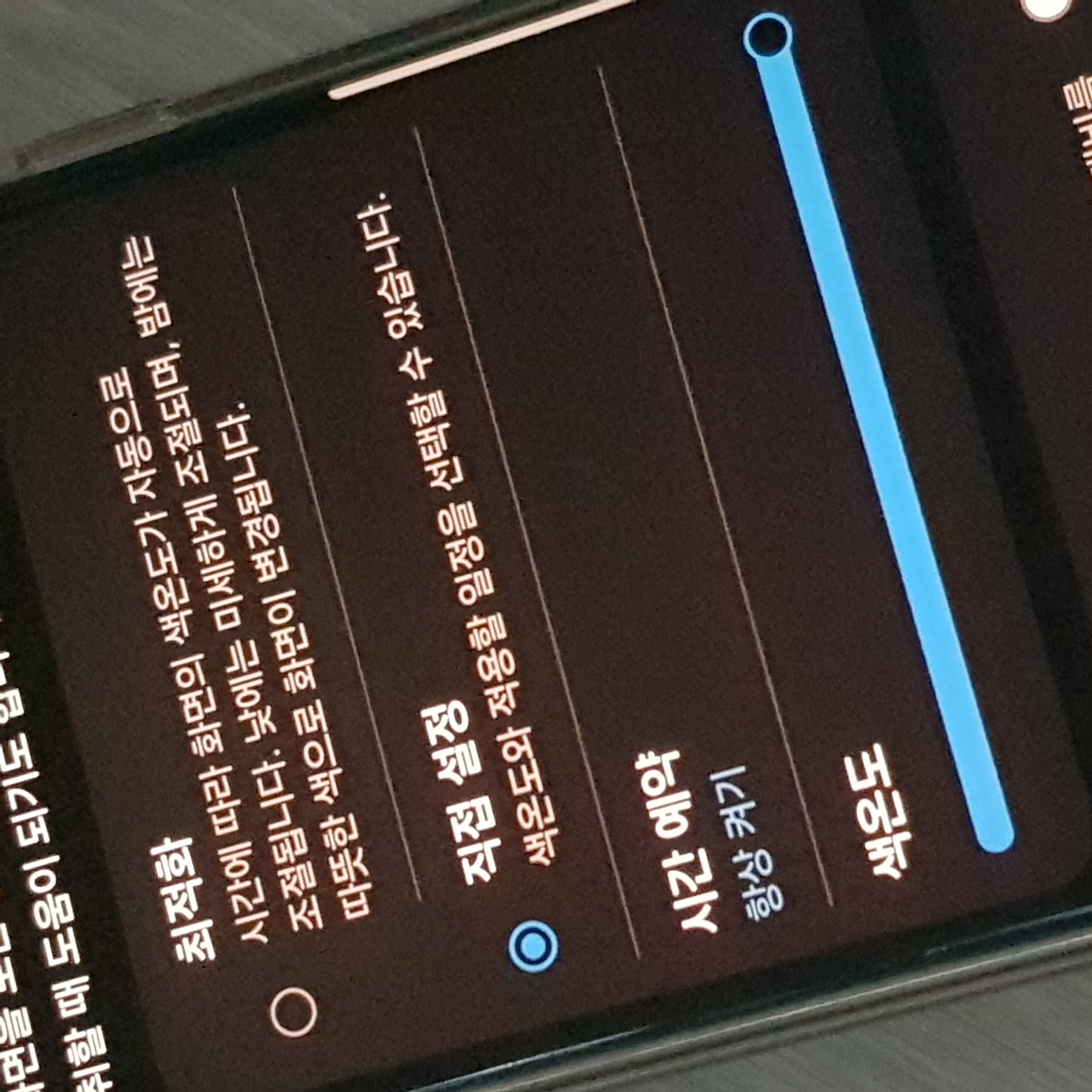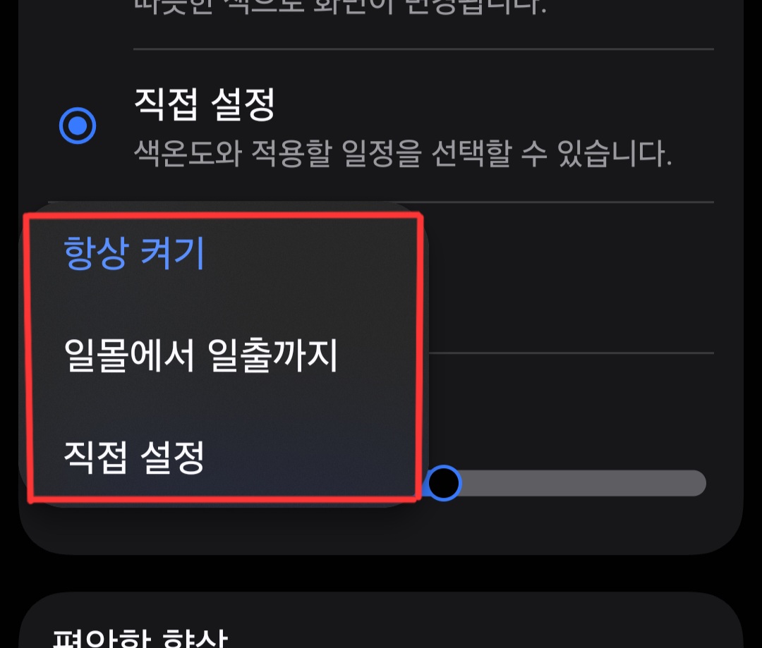 [시간예약] 에서는 항상 켜거나, 일몰 일출 사이만 활성화, 직접 설정 등 자세하게 설정이 가능합니다. 일과 시간에 화면의 색감을 정확하게 확인해야 한다면, 일과 시간에는 편안하게 화면 보기 기능을 끄고 퇴근 후 휴식 시간대에는 켜서 눈을 조금이나마 편하게 핸드폰을 이용하는 것도 하나의 방법입니다.