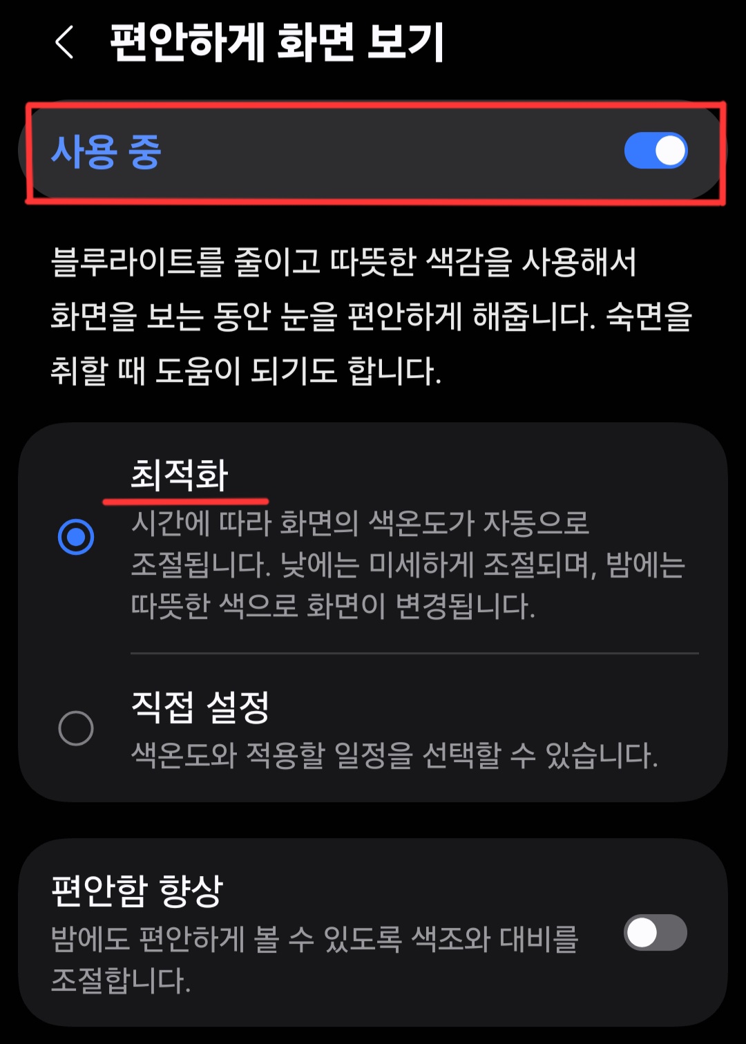 편안하게 화면 보기의 사용 중이 파랗게 활성화가 되어 있으면 적용이 된 상태입니다. 옵션에서 [최적화]를 선택해 주시면 시스템이 자동으로 색온도를 조절해 줍니다.