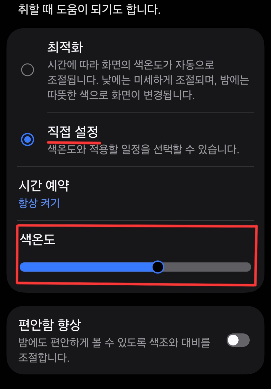 [직접 설정] 을 누르면 편안하게 화면 보기 기능을 실행할 시간과 색온도 등을 임의로 설정할 수 있습니다. 색온도를 높일수록 희고 푸른빛이 죽고 노랗고 빨간 계열의 색감이 더욱 살아납니다.