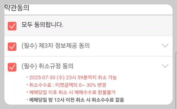 무통장 선택 후 아래로 내리면 [약관동의] 항목이 있습니다. [모두 동의합니다] 를 선택한 후 최종 예매 완료를 해주신 후 안내되는 계좌번호로 최종 입금을 하시면 됩니다. 티켓팅은 몇 초만 버벅되도 자리가 금방 선점되어 버려서 매번 떨리는데, 캡처 화면을 미리 보시는 것만으로 안심이 안 되신다면 현재 판매가 진행 중인 아무 스포츠 경기의 티켓 예매를 연습 삼아 진행해 보시기 바랍니다. 좌석 구성만 조금 다르지 전체적인 예매 과정은 비슷합니다.