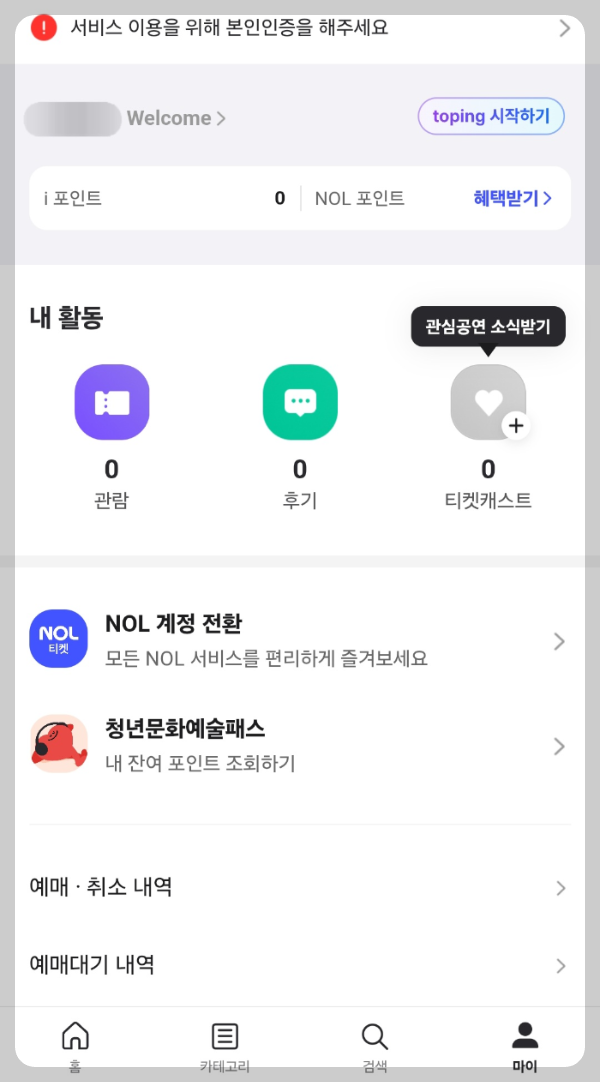NOL 인터파크 앱에 접속합니다. 처음 접속의 경우 티켓팅 전 마이페이지를 미리 확인해 주시는 게 좋습니다.